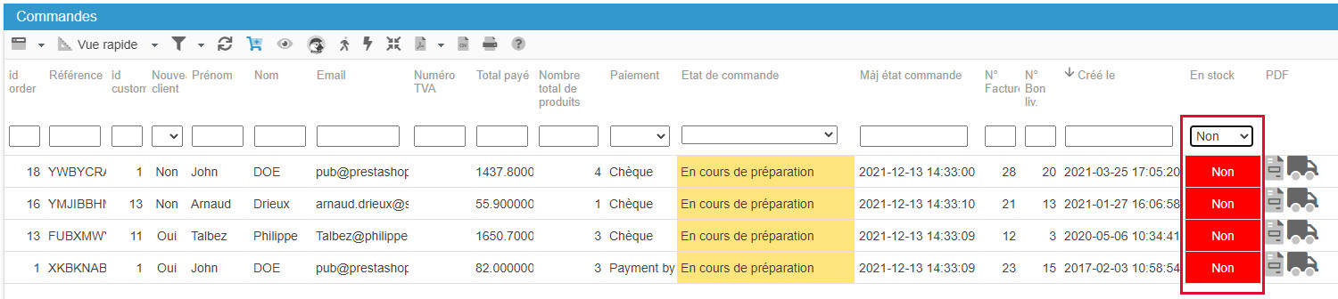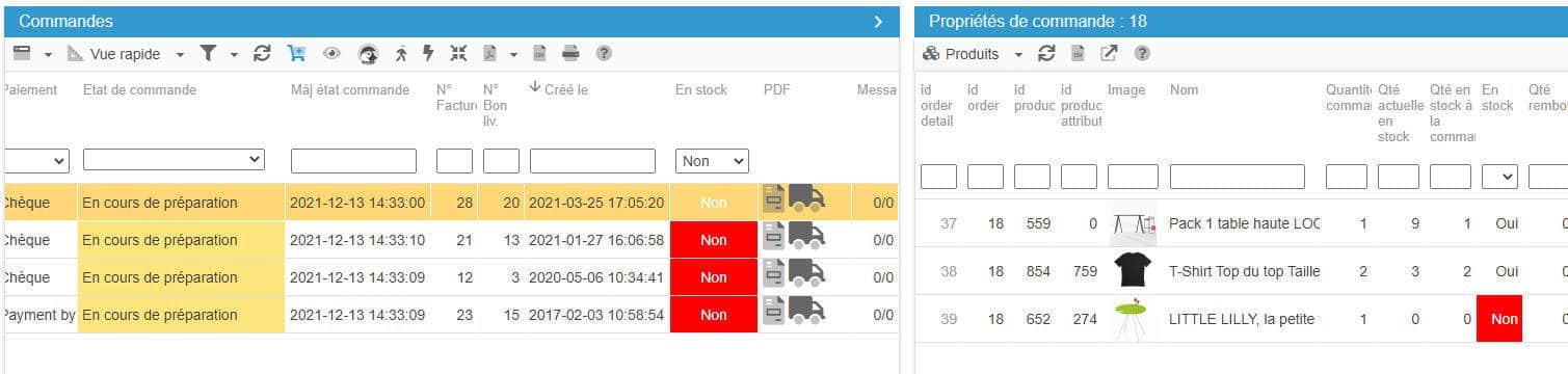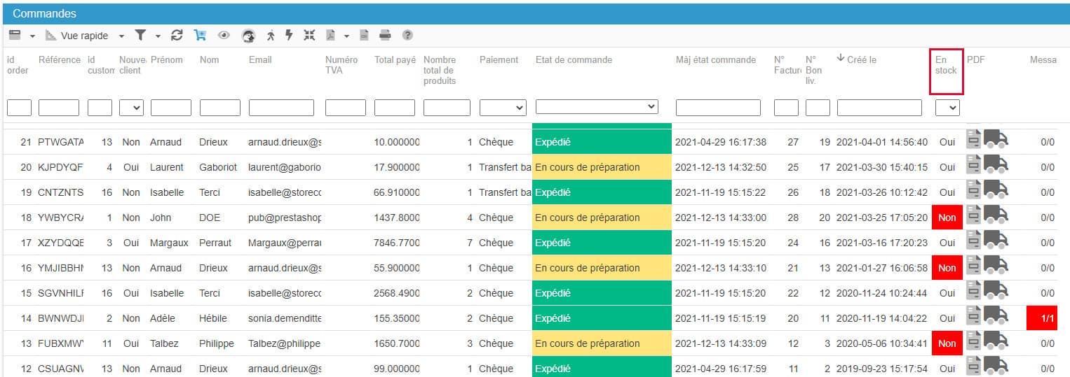 Dans l'interface des Commandes de Sc, vous verrez une colonne 'En Stock' qui affiche Oui/Non, et lorsque des produits commandés ne sont pas en stock, alors Non sera affiché en rouge :