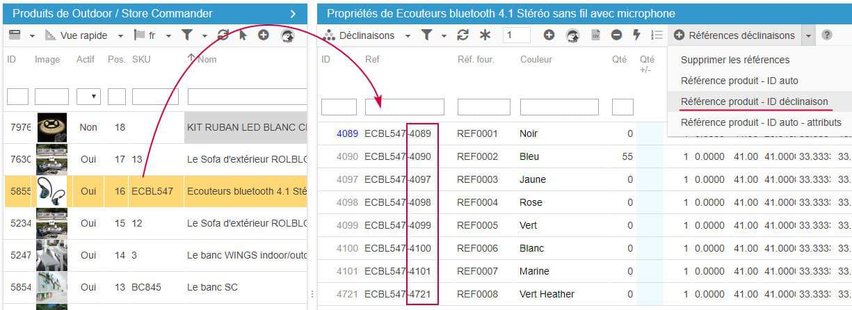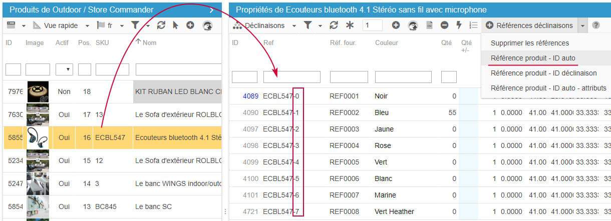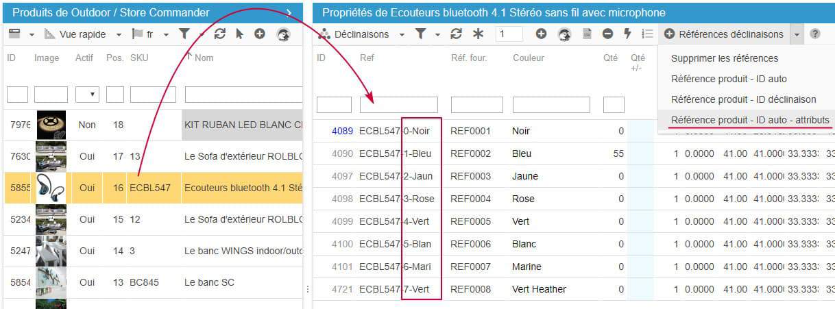 La référence générée utilisera la référence du produit parent + ID de la déclinaison.