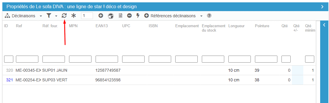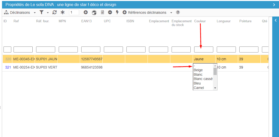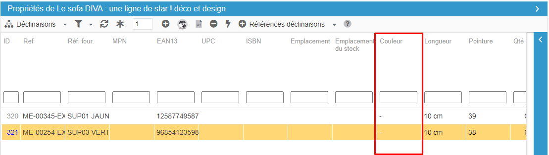 Pour ce faire, rendez-vous dans la propriété (panneau de droite) > déclinaisons et procédez comme ceci :