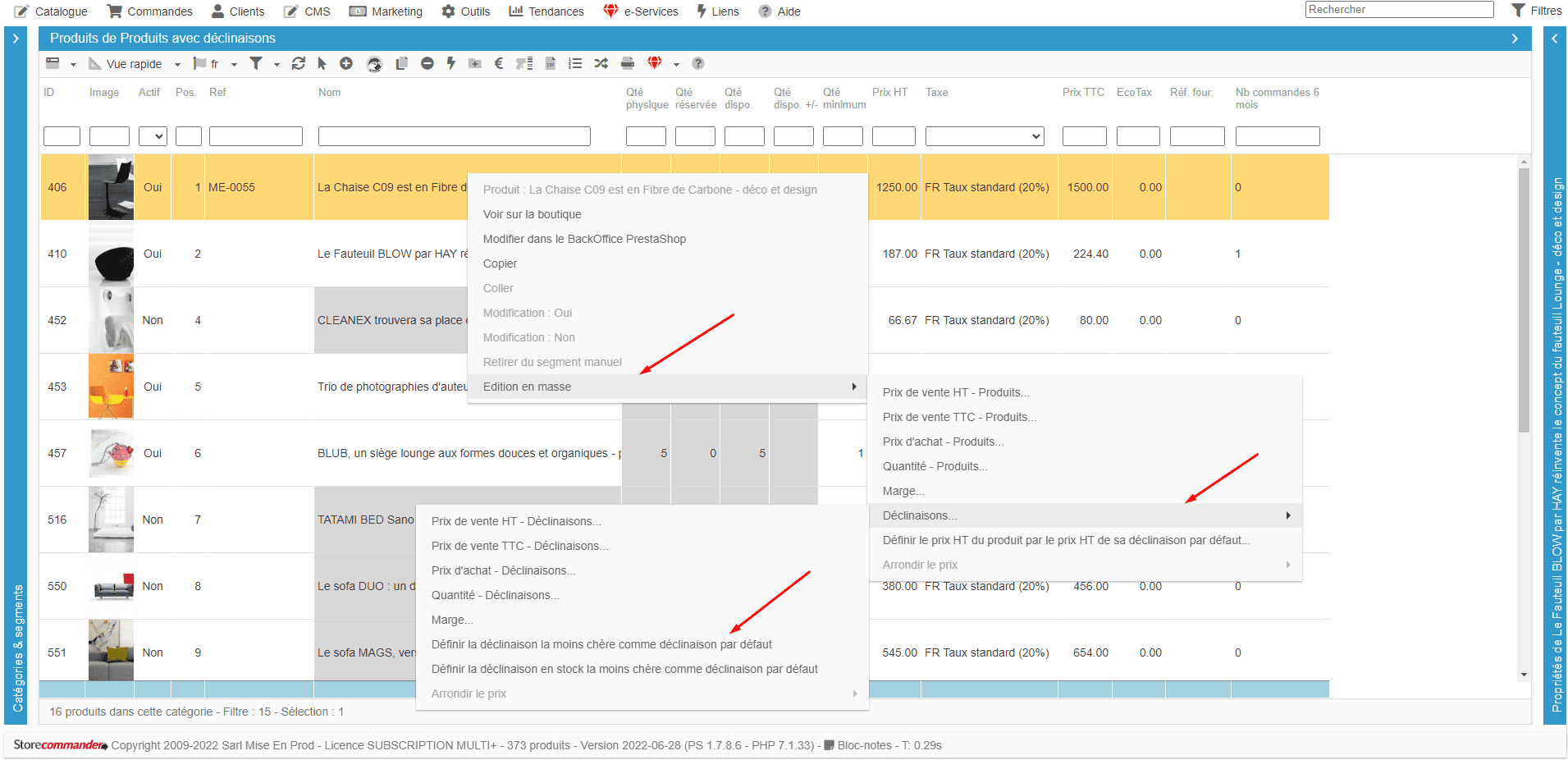 Lorsque vous êtes dans la grille produit (partie centrale de l'interface) sélectionnez un ou plusieurs produits avec déclinaisons puis faites un clic droit > édition en masse > déclinaisons > définir la déclinaison la moins chère comme déclinaison par défaut.