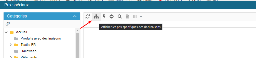 Pour afficher les prix spéciaux de vos déclinaisons, activez cette icône dans la barre d'outils :