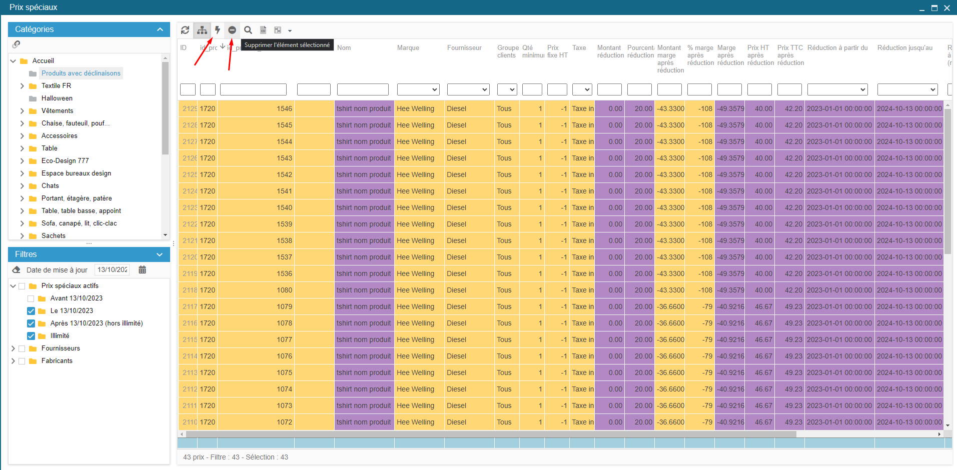 Notez que la suppression s'applique sur les prix spéciaux. En aucun cas cela supprime des produits ou des déclinaisons.