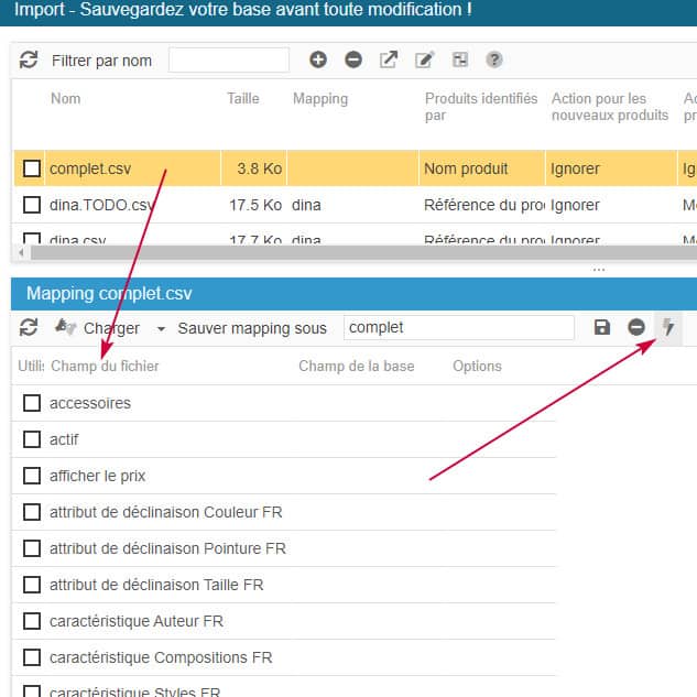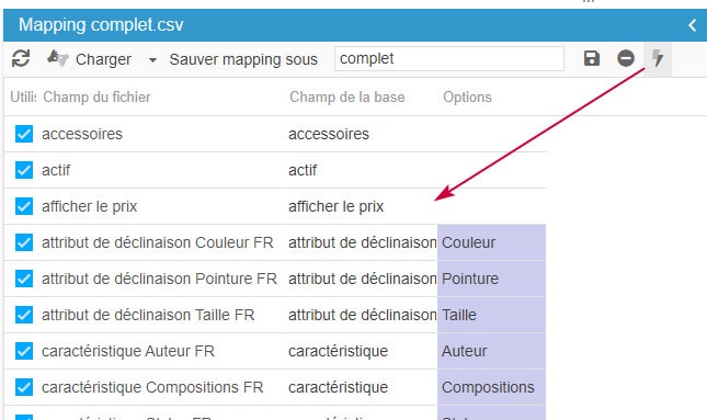Sur la barre d'outil du panneau de mapping, cliquez sur l'icône 'Charger les champs pour import' - agrandissez le panneau si nécessaire.