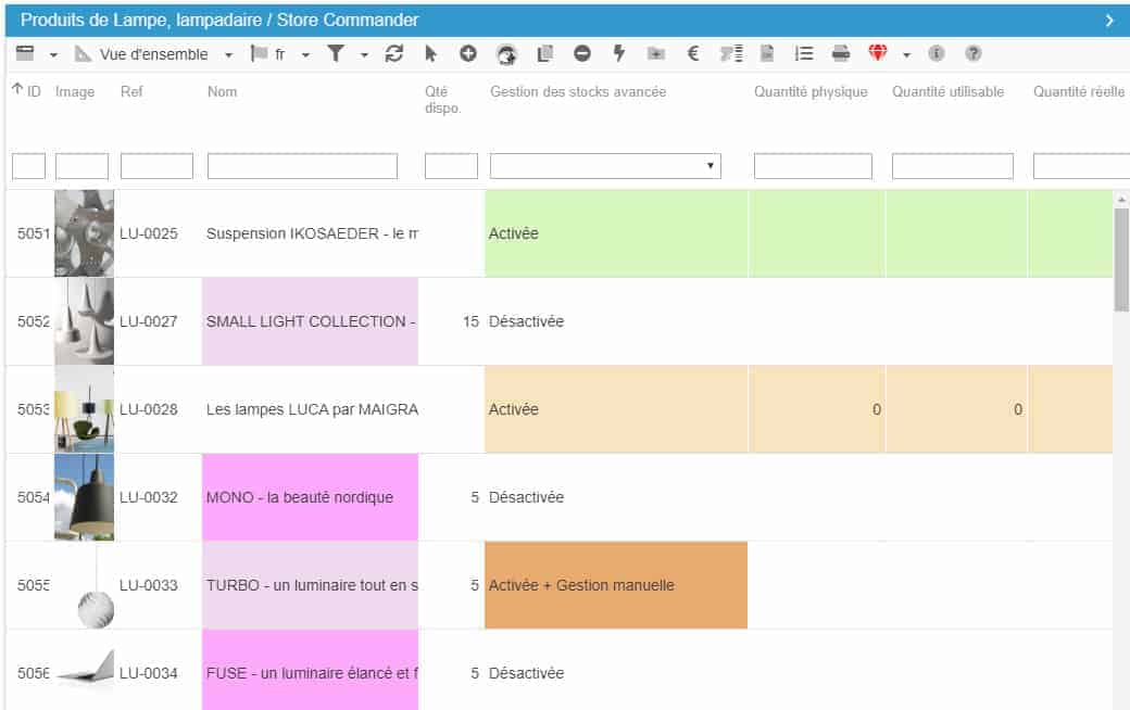L'activation de l'option de gestion des stocks avancés dans PrestaShop introduit de nouvelles colonnes dans l'interface de Store Commander :