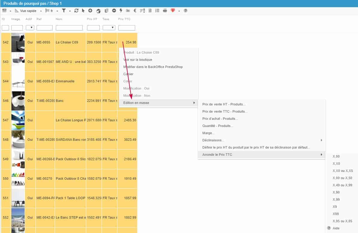Les fonctions d'arrondis des prix en masse se situent dans le menu contextuel de Store Commander lorsque votre souris de trouve dans une des colonnes de prix, à savoir prix d'achat, prix HT et prix TTC.