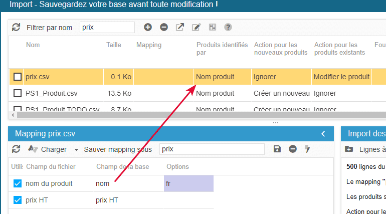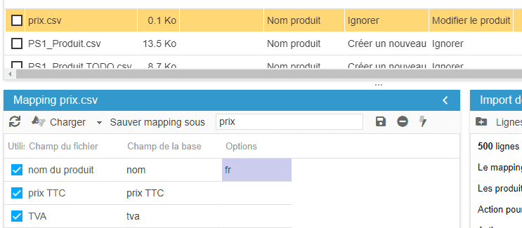 Dépendant de l'identifiant choisi, ici nous utilisons le nom du produit, voici l'exemple d'un fichier, son mapping et les options à utiliser dans la fenêtre d'import de Sc :