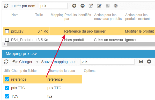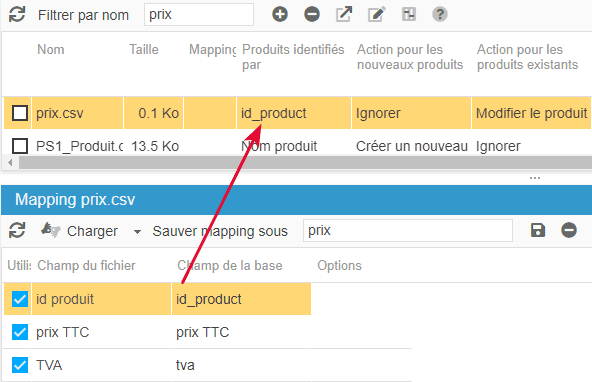 - l'identifiant du produit, c'est à dire le nom du produit, son ID, sa référence ou encore son code EAN13. L'important est que cet identifiant soit unique sur chaque produit (pas de doublon).