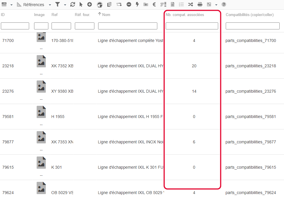 La vue Références de la colonne centrale des produits inclut un champ intitulée "Nb. compat. associées' qui vous permet d'identifier le nombre de compatibilités utilisées sur vos produits.