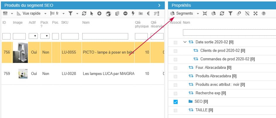 ou bien utiliser la grille Segments qui se trouve dans la colonne des Propriétés (à droite), quelque soit l'interface.
