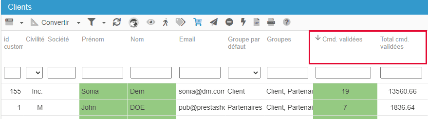 Dans l'interface Clients de Store Commander, vous trouverez la vue Convertir, dans laquelle se trouve les champs 'Cmd Validées' et 'Total Cmd Validées'.