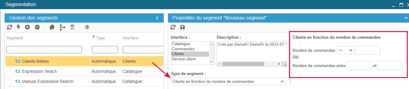 Pour obtenir une liste de clients en utilisant des critères plus précis sur le nombre de commandes ou bien en fonction du montant commandé, alors l'outil Segmentation sera approprié.