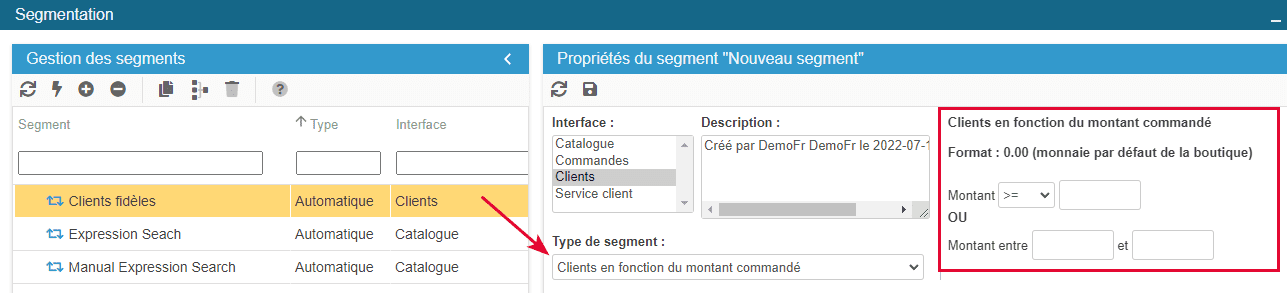 Ou encore un segment automatique avec le type 'Clients en fonction du montant commandé' en indiquant les valeurs que vous souhaitez :