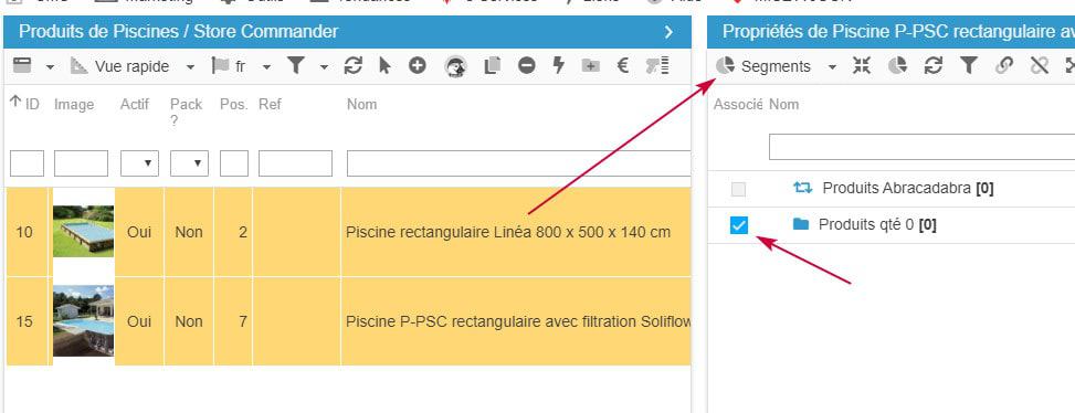 Dans la colonne de droite, une grille 'Segmentation' est disponible, affichant la liste de vos segments. Après avoir sélectionné les éléments dans la colonne centrale, vous pouvez simplement cocher les cases correspondantes aux segments dans lesquels vous souhaitez ajouter les produits.