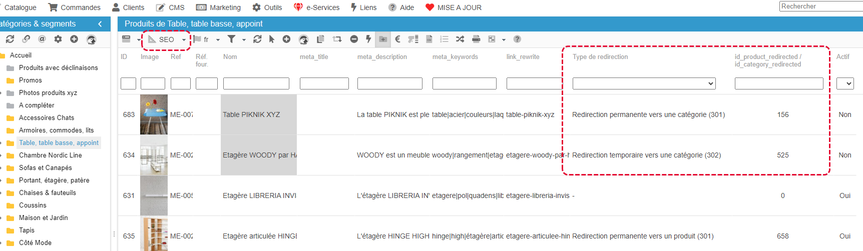 Dans l'interface Store Commander, vous trouverez ces champs de redirection dans la vue SEO :