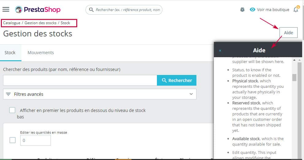 Pour en savoir plus sur la définition de ces champs, affichez la page d'Aide dans votre backoffice PrestaShop lorsque vous êtes sur la page 'Gestion des stocks > Stocks' :
