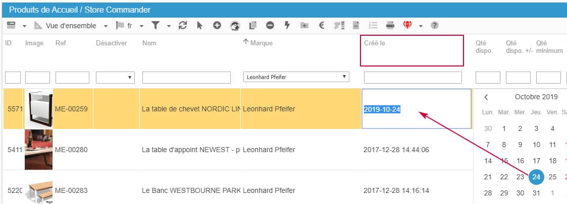 Editez ensuite la date de création du premier produit de la liste avec la date du jour