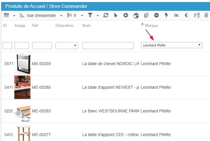 Dans l'interface de Store Commander, affichez par exemple tous les produits d'un même fabricant dans la vue Référence ou la vue d'Ensemble.