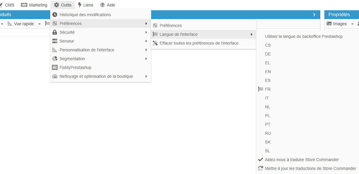 L'interface de Store Commander est en effet disponible en plusieurs langues, telles que le français, l'anglais, l'allemand, l'italien, l'espagnol entre autre.