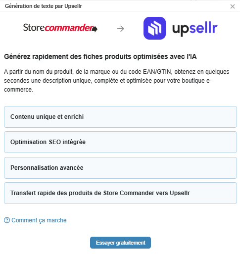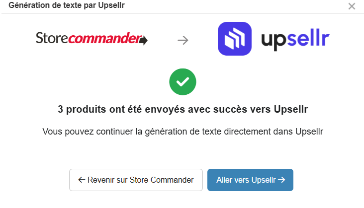 La fonctionnalité Upsellr intégrée à votre Store Commander permet de facilement et rapidement envoyer vos produits vers l'agent ID d'Upsellr afin d'enrichir leur contenu.